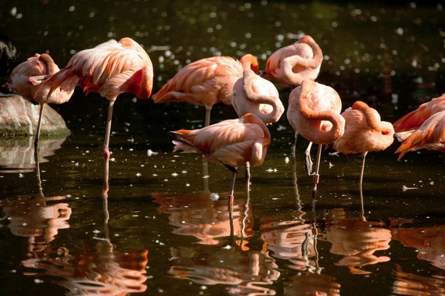 Immer wieder ein Anziehungspunkt ist der Flamingosee. Das wunderschöne, farbenprächtige Gefieder der Flamingo-Kolonie ist einzigartig. Besonders reizvoll ist das Farbenspiel, wenn sich die satte Farbe des Flamingogefieders im Wasser des Sees spiegelt. Da schlägt das Herz des Fotografen höher. Im Übrigen findet man am Flamingosee noch so manch anderen gefiederten Gesellen. Es kommt schon vor, dass sich ein Storch oder ein Reiher unter die Flamingos mischt. Die männliche Mandarinente gilt wegen ihrer vielfältigen Färbung und Musterung als eine der schönsten Enten der Welt, Auch sie trifft man am Flamingosee an. Wer zur Balzzeit der Flamingos im Zoo ist, erlebt ein ganz spezielles Schauspiel, Die Männchen führen ritualisierte, balettartige Tänze durch.